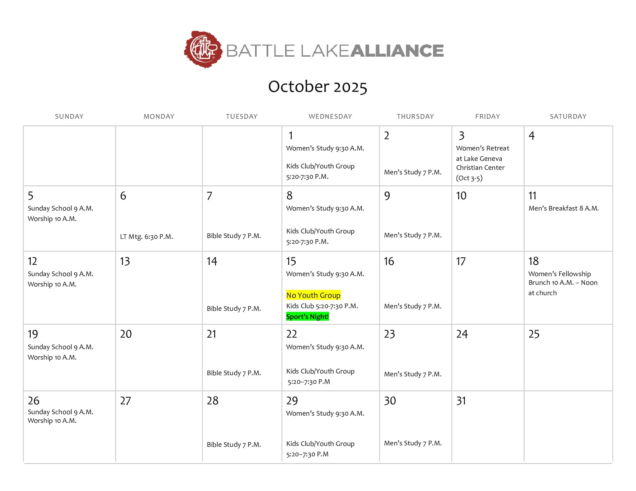 Activities and Events of Battle Lake Alliance Scheduled for October 2025