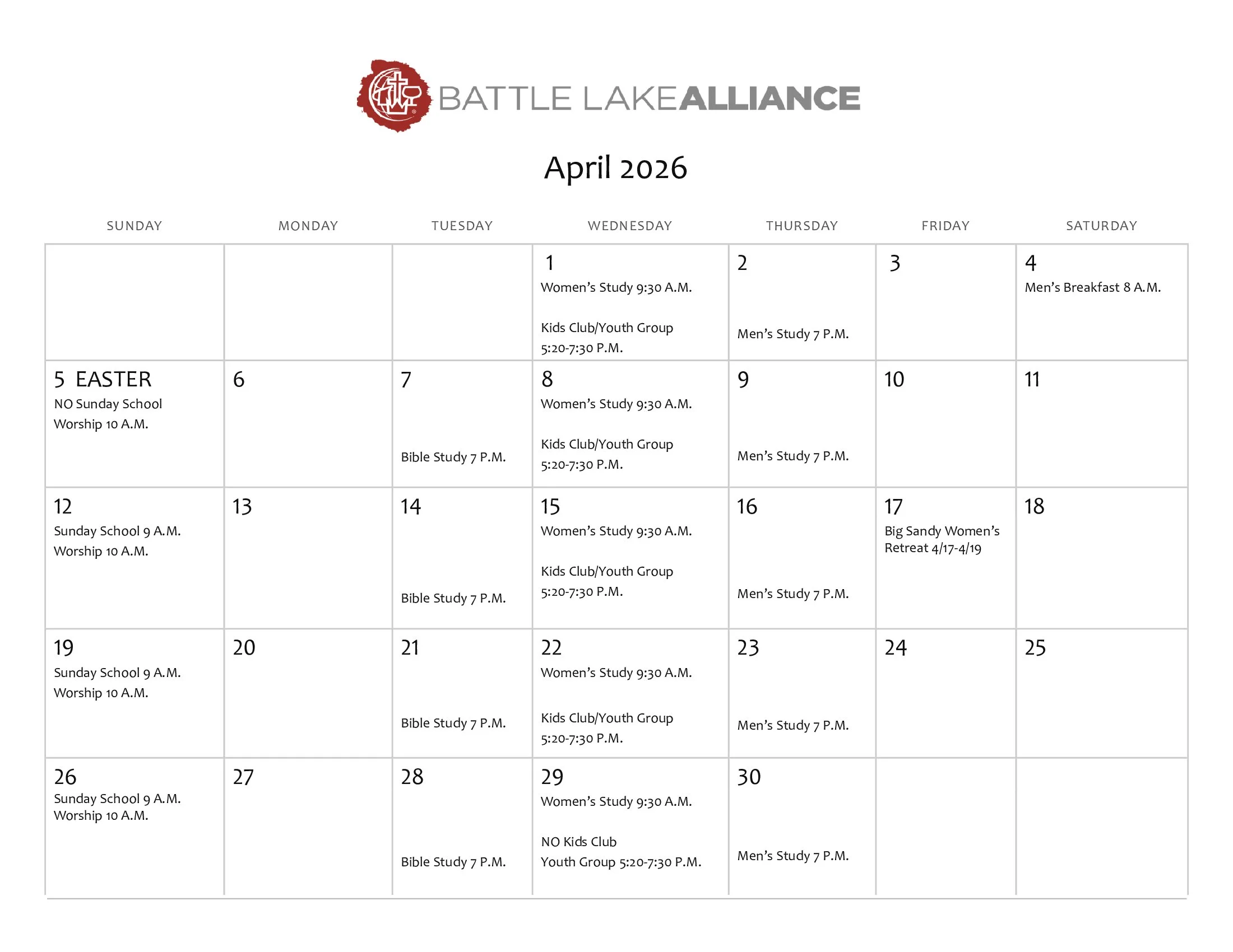 Activities and Events of Battle Lake Alliance Scheduled for April 2026